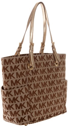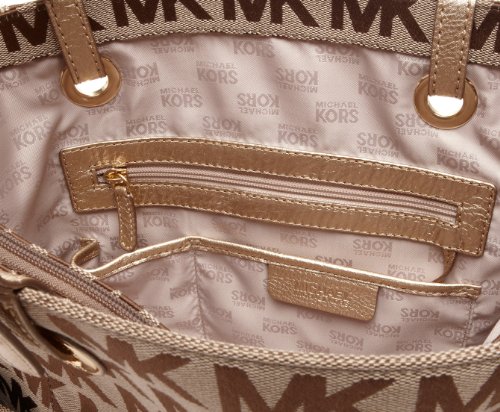 - One slip pocket on each side; Golden MK medallion hangs from strap of tote