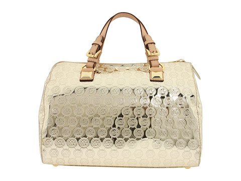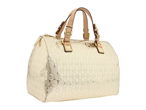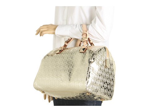 - Pale gold metallic leather with allover logo monogram detail