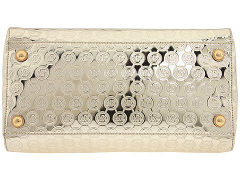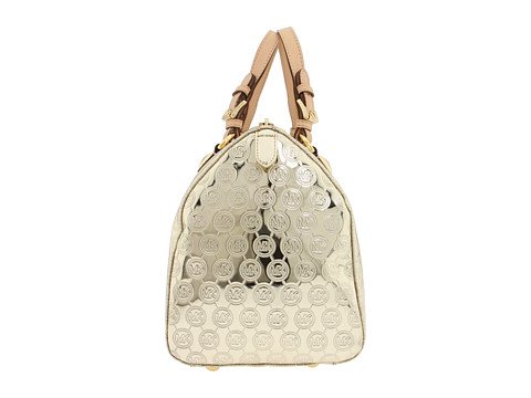 ?Pale gold metallic leather with allover logo monogram detail.