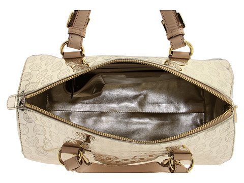 - Logo charm hangs from beige leather strap. Zip top closure