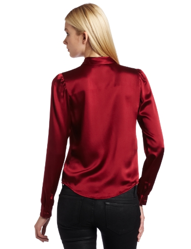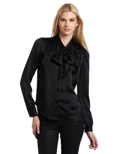 The silk blouse button-up front and ties that you can either leave long or tie in a bow at the neck