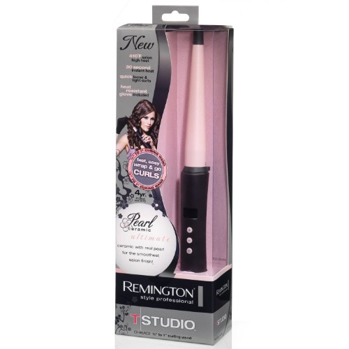 Gorgeous salon-created curls are a breeze with the new T Studio Pearl Ceramic Professional Styling Wand. Featuring a high-tech ceramic wand infused with real pearl, this patent-pending technology provides the most advanced ceramic surface for the smoothest glide on the market. Your hair is left smooth and silky with a luminous luster. This must-have styling tool offers easy-to-read digital controls and heats up to salon-standard 410 F so you get picture perfect curls that last all day. The multifunctional tool has a cone shaped design offering a variety of dimensions to meet your style needs.The Remington T|Studio Pearl Ceramic Professional Styling Wand combines advanced technology and high-performance ceramic coatings with real crushed pearl to create a curling wand that delivers professional, salon-quality results. It quickly reaches a temperature of 410 degrees and has a high-tech barrel with ceramic coating to help you effortlessly achieve super sleek, high definition curls--without snagging or catching.